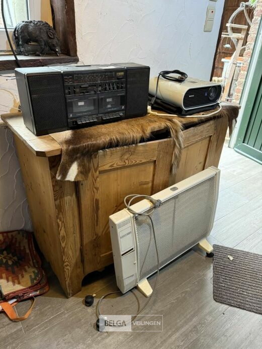 Kastje met diverse toestellen, waaronder een beamer, radiotoestel, elektrische radiator. Maten kastje: 115x47x83cm. De werking van de toestellen is onbekend en niet getest. Zij worden verkocht in de staat waarin het zich bevindt, met zichtbare en onzichtbare gebreken. Maak gebruik van het kijkmoment om u te voorzien van de nodige indrukken.’