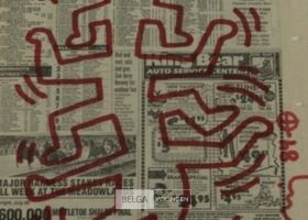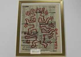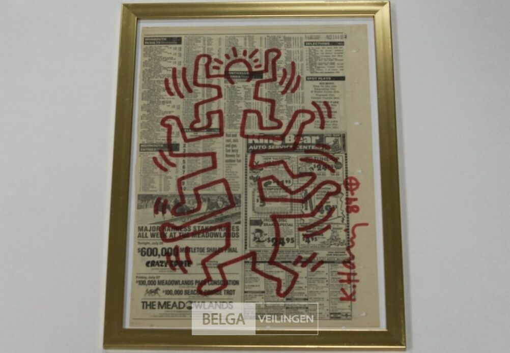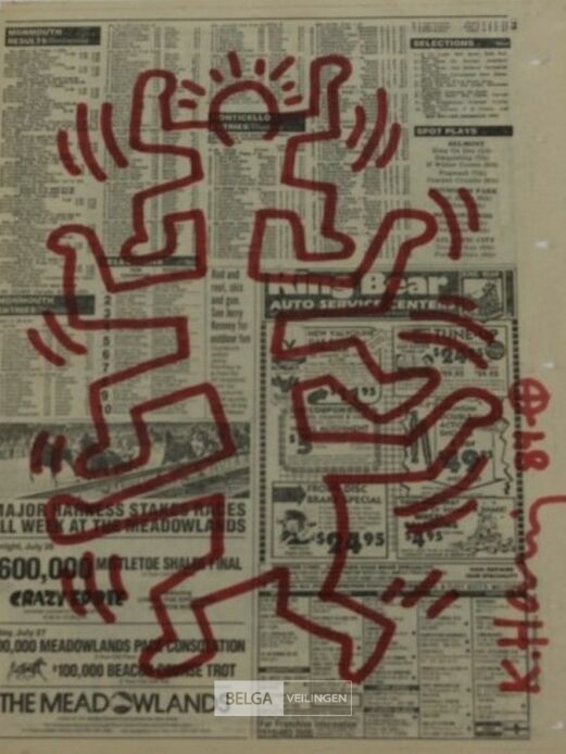 surfing' op Daily news paper july 26, 1984 - Originele tekening (rode stift) - Handgesigneerd en gedateerd 1984 - in kader 33x43 - incl. provenance privé collectie Knokke - Galerijprijs 4000 euro