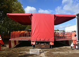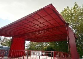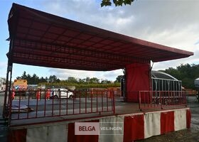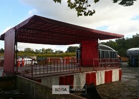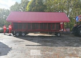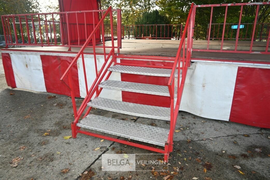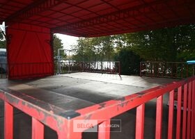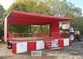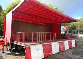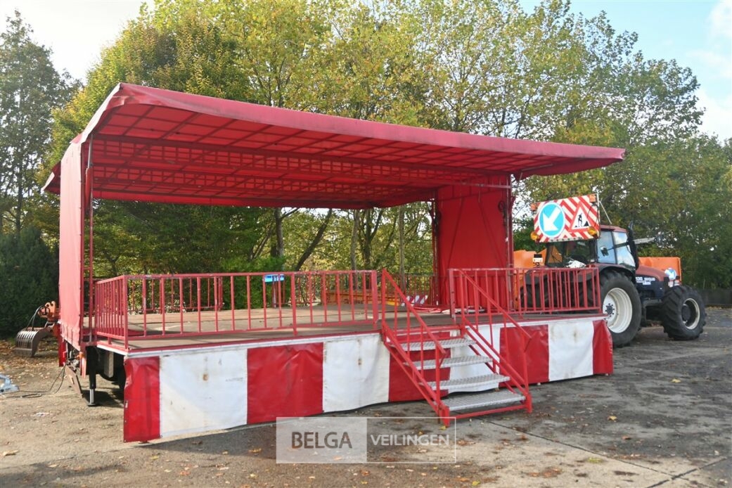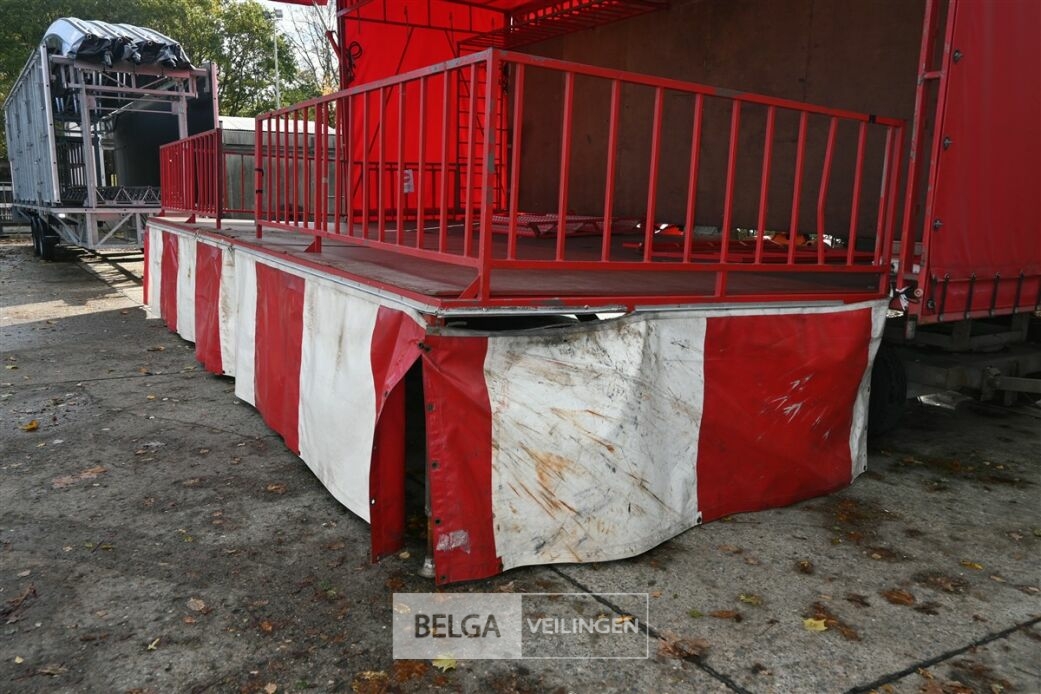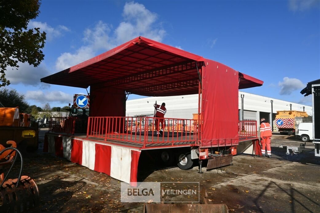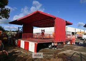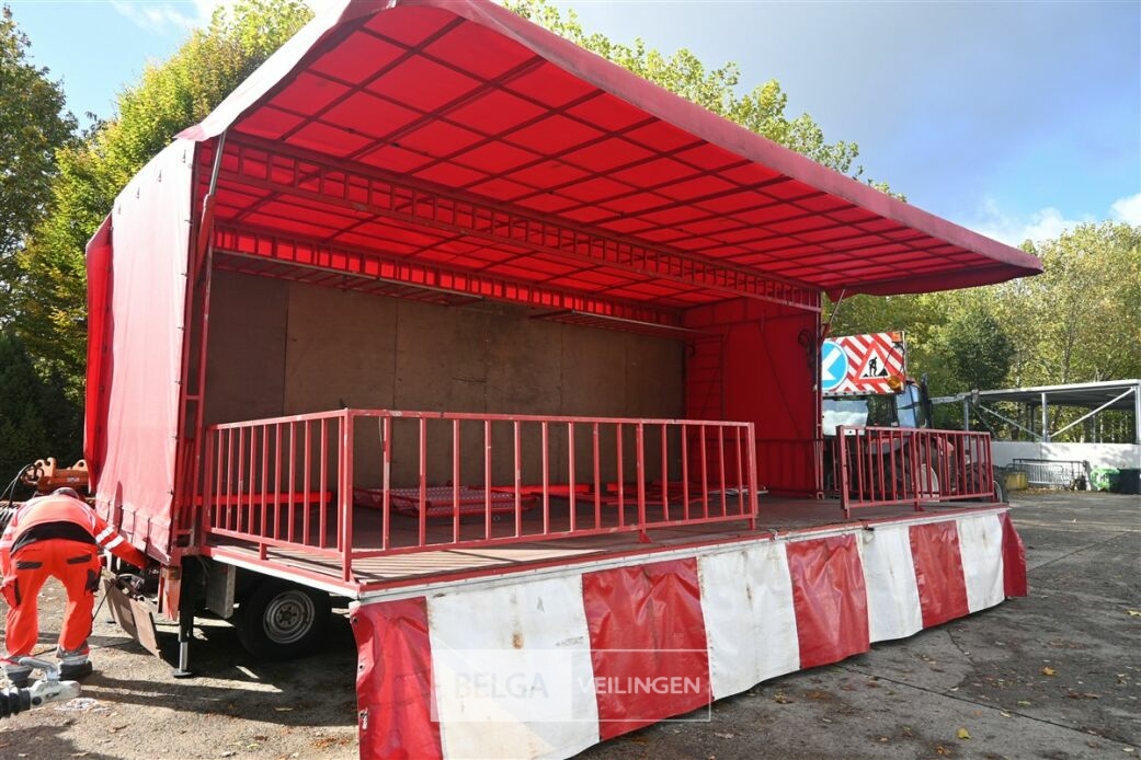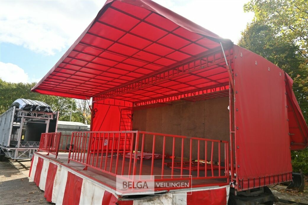 Kiosk / hydraulische podiumwagen, merk JOS BAETEN, type, MKH, bouwjaar 1990, afmetingen kiosk : breedte 270cm, hoogte 395cm, lengte 800cm, lengte dessel 250cm, totale lengte 1050cm, afmetingen podium : hoogte van grond tot podium 95cm, vrije hoogte op podium 250cm, half open 760x465cm, volledig open 760x685cm