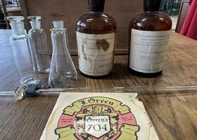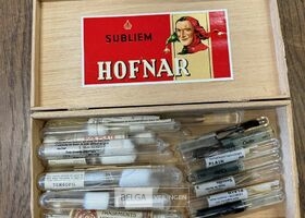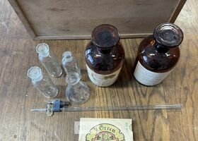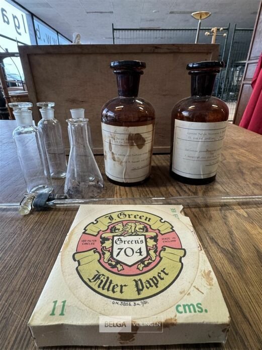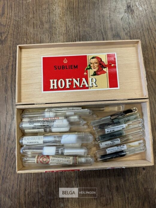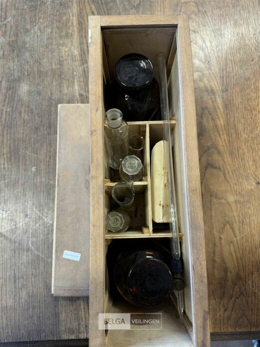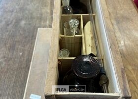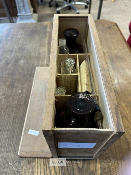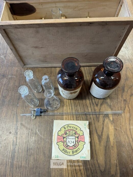 Kistje met wetenschappelijke chemieset – o.a. Met medisch materiaal , chirurgisch hechtmateriaal, antiseptische verbanden