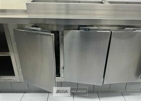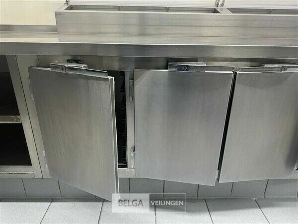 rvs werktafel in L-vorm, 360 x 80 x 70 cm en 155 x 70 x 70 cm met 3-deurs koeling, saladette, 4 laden, vuilniszakhouder