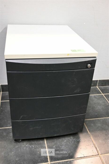 Ladenblok: Blauw met 4 donkergrijze lades en lichtgrijs blad, afm 44x57x58 cm, verrijdbaar
