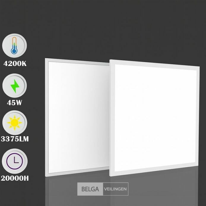 8 x LED-paneel 45W – 60 × 60 cm – 4200K – Super ECO – Wattage: 45W, Lichtopbrengst: 3375 lm, Kleurtemperatuur: 4200K (Neutraal wit), Spanning: 175–265 V AC / 50–60 Hz, LED-type: SMD LED, Kleur: Wit, Beschermingsgraad: IP20 (droge binnenruimtes), Lichtspreidingshoek: 120°, Afmetingen: 595 × 595 × 35 mm, Detail: Backlight paneel, Levensduur: ± 20.000 uur – IRC: >80 Ra – LED-type:SMD – Beamhoek: 120° – Inclusief transformator – Efficiënte en gelijkmatige lichtverdeling – Super ECO, energiezuinig en milieuvriendelijk ontwerp – Geschikt voor gebruik binnenshuis.