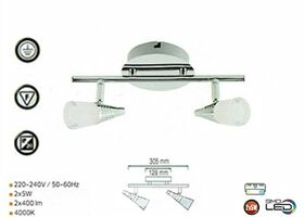 8 x LED plafondlamp 2 spots model DI03 – Maximaal vermogen 2 x 5W –Kleurtemperatuur 4000K (neutraal wit) – Lichtstroom: 650 lumen – Afmetingen: 305 x 50 mm – Beschermingsgraad: IP20 – Kleur: Zilver – Spanning: 220-240V (50/60 Hz) – Inclusief lampen. Ideaal voor moderne binnenverlichting in woonkamersNs, slaapkamers, kantoren en gangen.