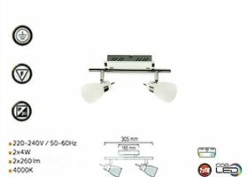 4 x LED plafondlampen 2 spots model HL7192L – Maximaal vermogen 2 x 4W – Kleurtemperatuur 4000K (neutraal wit) – Lichtstroom: 520 luMens – Afmetingen: 305 x 70 mm – Bescherming: IP20 – Kleur: Zilver – Spanning: 220-240V (50/60 Hz) – Inclusief lampen – Geschikt voor stijlvolle en moderne verlichting in uw binnenruimtes: woonkamers, slaapkamers, kantoren en gangen.