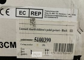 Licensed Abarth children's pedal go-kart black Niet-gecontroleerde Retouren. Dit product betreft een retourzending die niet is gecontroleerd op kwaliteit en werking. Het kan in perfecte staat zijn, maar er kunnen ook ontbrekende onderdelen, gebruikssporen of andere kleine gebreken zijn. Het product wordt verkocht in de staat waarin het is ontvangen. Geen garantie of retour mogelijk.