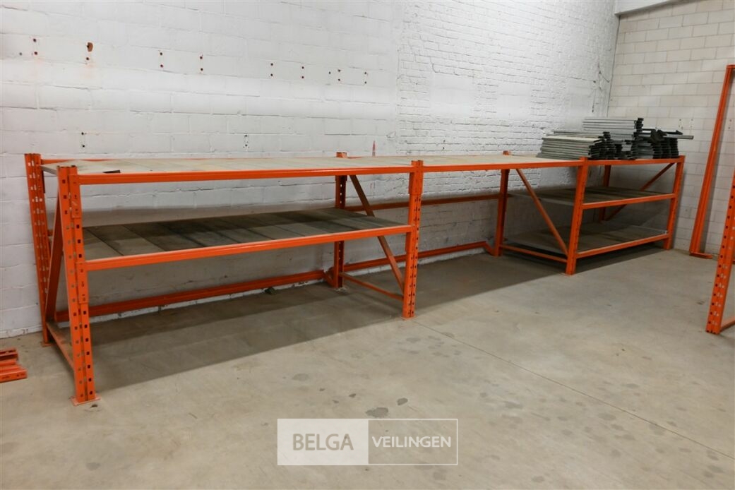 Magazijnrek oranje, 3 staanders 100 cm x 125 cm , 14 liggers zware uitvoering, lengte 230 cm en 60 cm, galva legborden. + 60 galav legborden.
