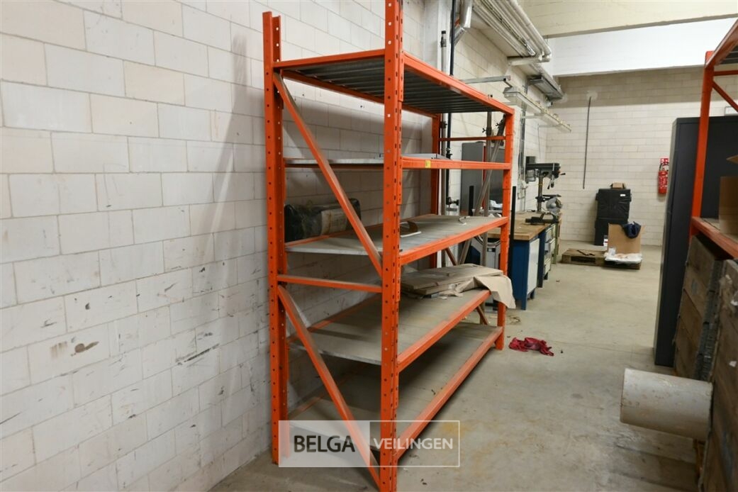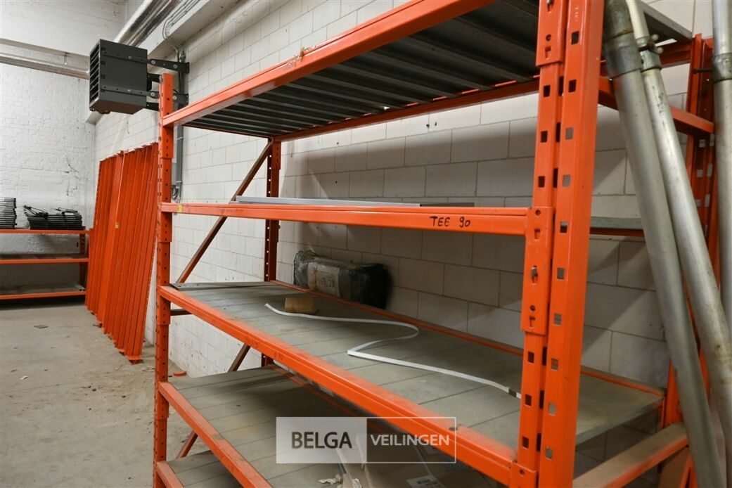 Magazijnrek oranje, 2 staanders 70 cm x 235 cm en 70 cm x 210 cm , 10 liggers zware uitvoering, lengte 230 cm en 75 cm, galva legborden. + 75 galav legborden .
