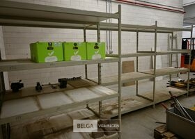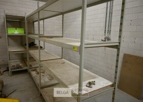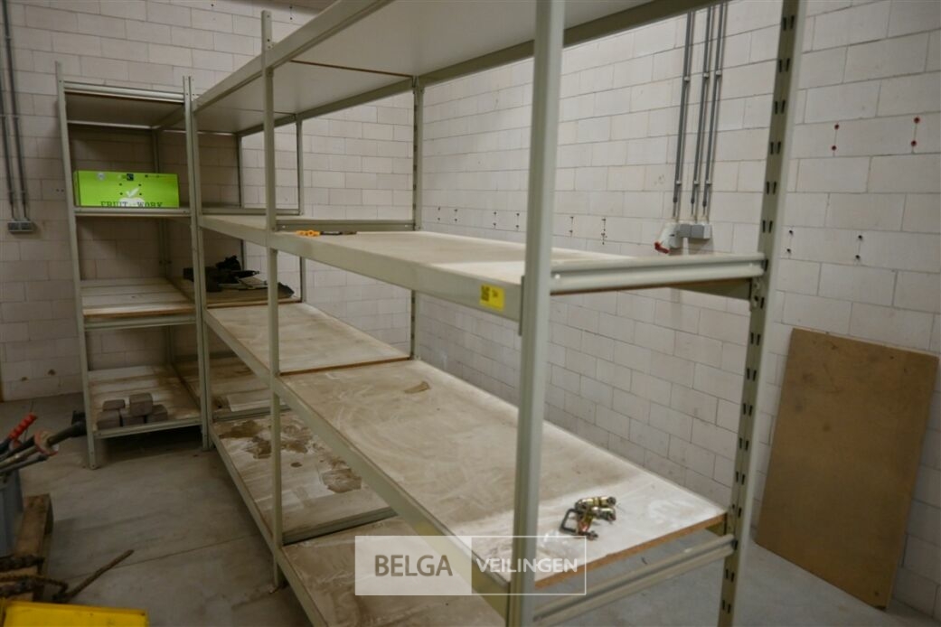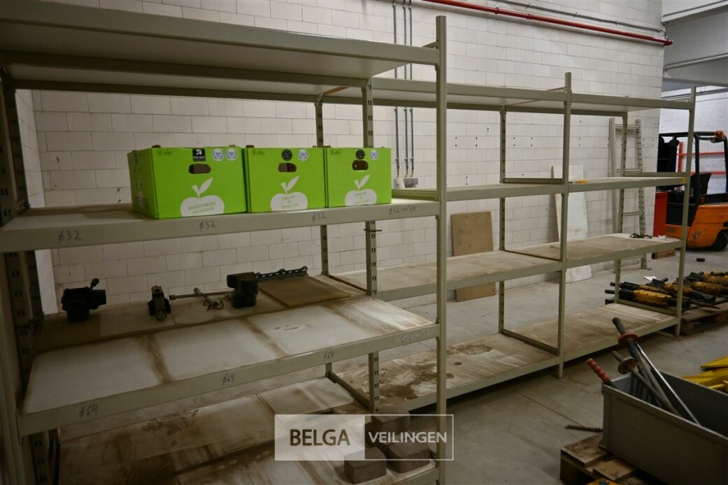 Magazijnrek Overtoom, grijs metaal met houten leggers, bestaande uit 5 elementen van 155 cm x 60 cm x 210 cm, 4 volledige elementen met 4 leggers, 3 losse staanders, 4 horizontale balken, 3 planken