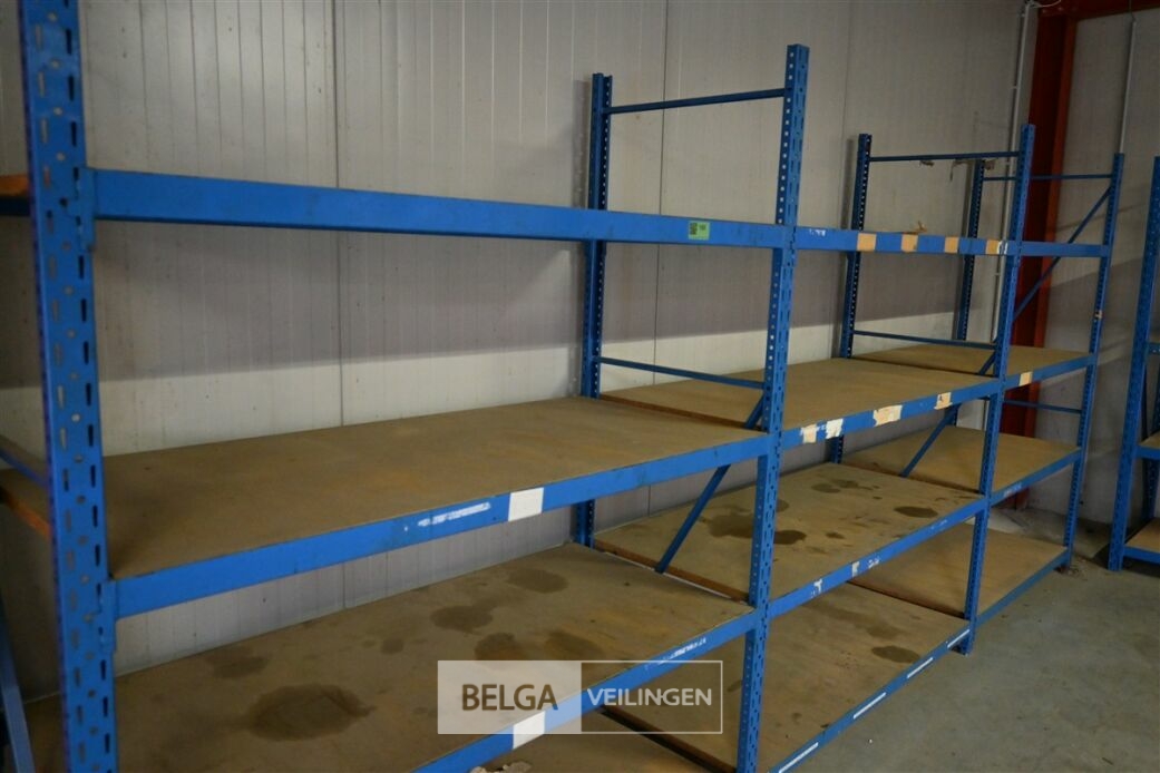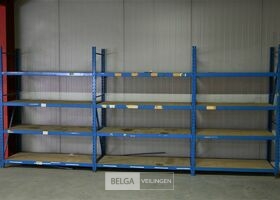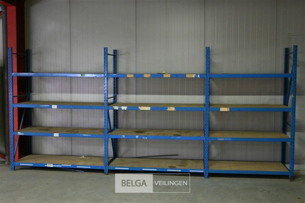 3x Magazijnrekken, Blauw metaal 2x afm 155x65x200 cm en 1x afm 140x65x200 cm, 4 staanders en 12 leggers