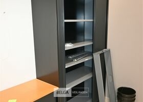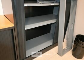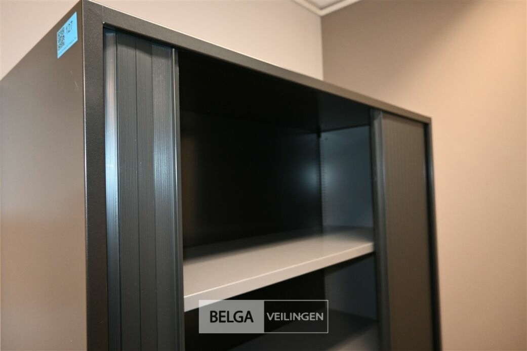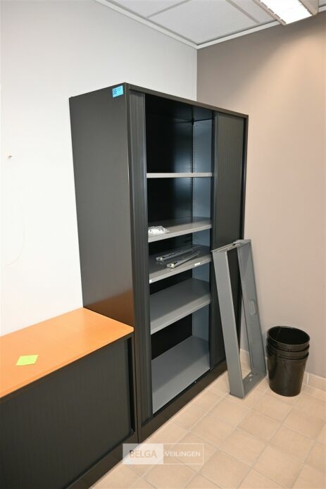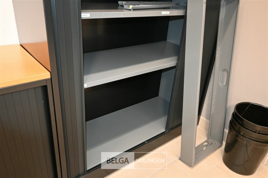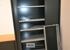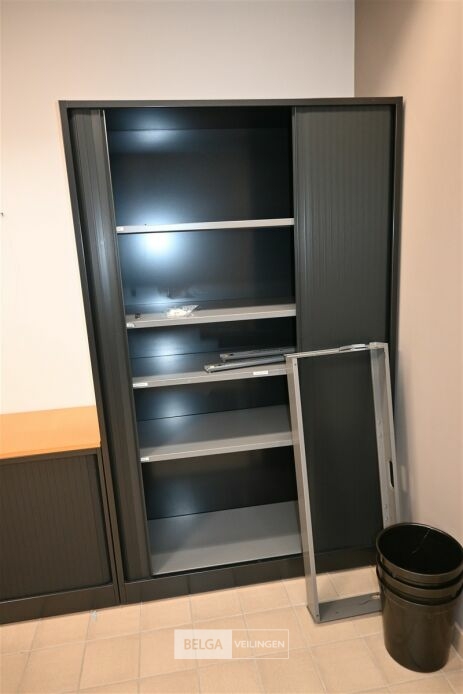 Metalen dossierkast met roldeuren, afm 120x46x195cm. Opgelet! Dit lot bevindt zich op de eerste verdieping en dient door de koper zelf naar beneden te worden gebracht.