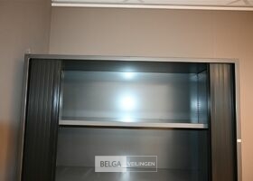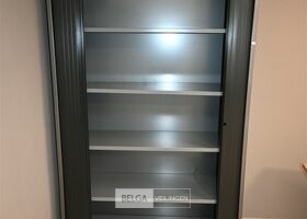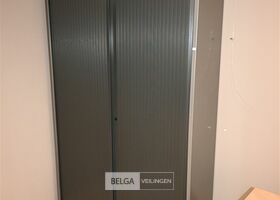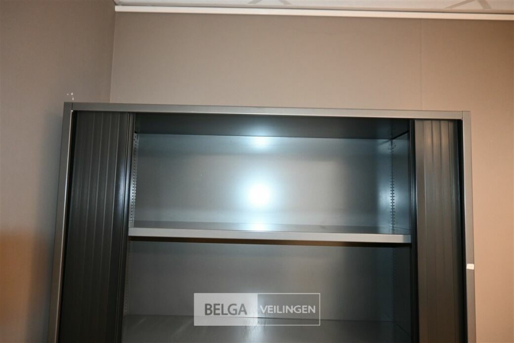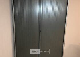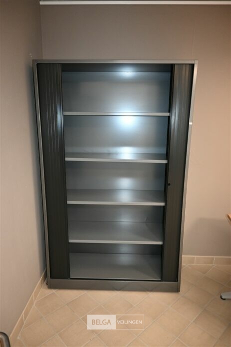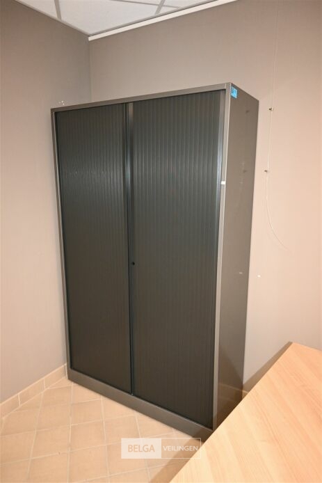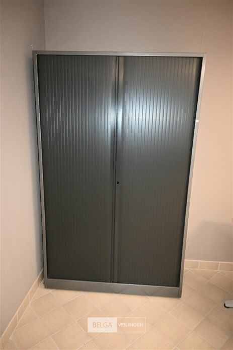 Metalen dossierkast met roldeuren, afm 120x46x195cm. Opgelet! Dit lot bevindt zich op de eerste verdieping en dient door de koper zelf naar beneden te worden gebracht.