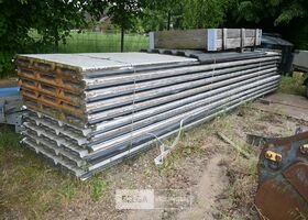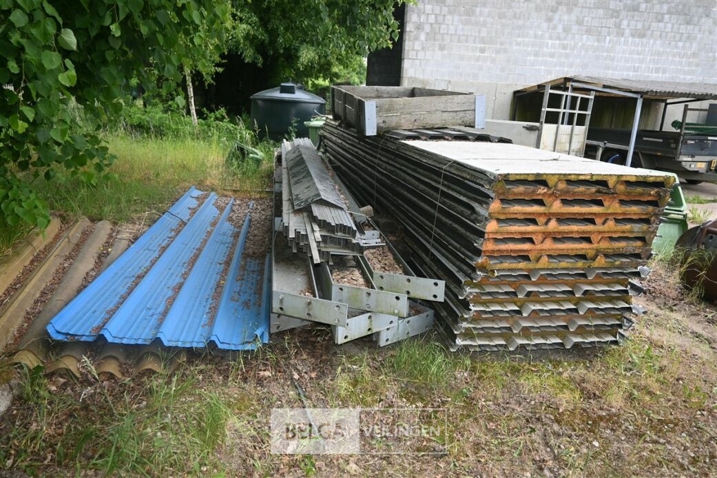 Metalen uitbouw met dakplaten (circa 10 stuks, 150x110cm), palen en spanten