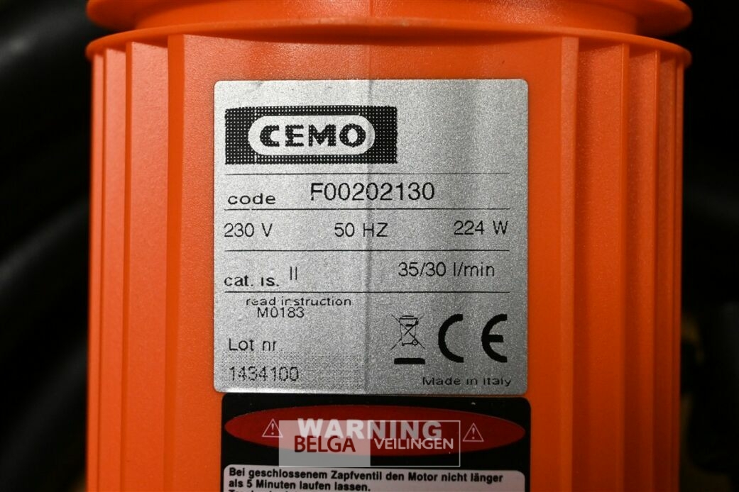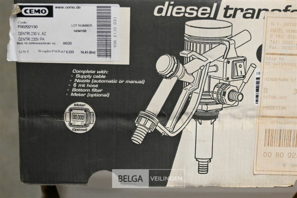 Nieuwe elektrische diesel en benzine pomp, merk CEMO, 230V., 224 W, debiet 35/30l/min. OPGELET: De werking van het artikel is onbekend en niet getest. Het artikel kan geïnspecteerd worden tijdens de kijkdag. Het artikel wordt verkocht in de staat waarin het zich bevindt, met zichtbare en onzichtbare gebreken.