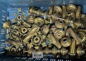 Onderdelen messing kroonluchters en lampen + geldkistje met sleutel – excl. Plastieke bak