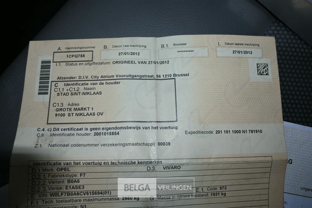 OPEL VIVARO lichte vrachtwagen, chassisnummer WOLF7B0A6CV615694, 79.122km, handgeschakeld, diesel, euro 5, motorinhoud 1995cm3, motorvermogen 66kW, sleutel en boordpapieren (kentekenbewijs, gelijkvormigheidsattest, keuringsbewijs en identificatieverslag) aanwezig, voertuig heeft mogelijk platte batterij, de koper dient zelf te voorzien in middelen om de wagen te starten