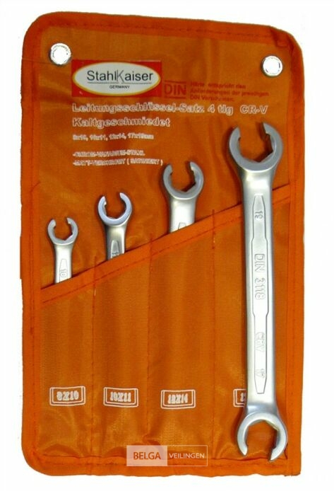 Rem/koppelings leidingsleutelset 4-dlg. CV, 8x10, 10x11, 12x14, 17x19 mm-Koud gestampt, DIN Chroom Vanadium.