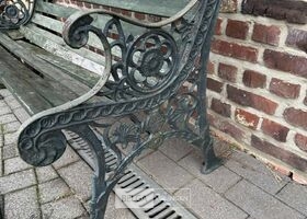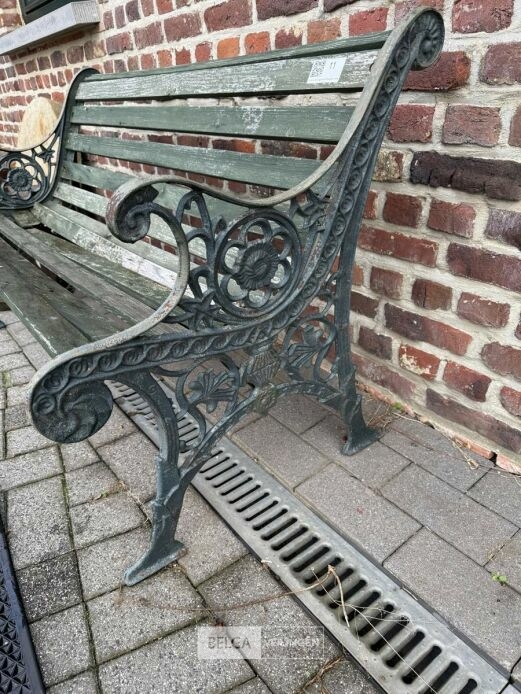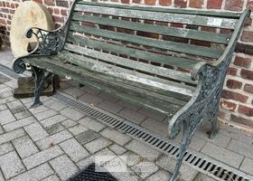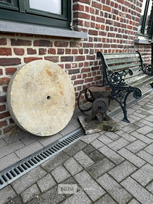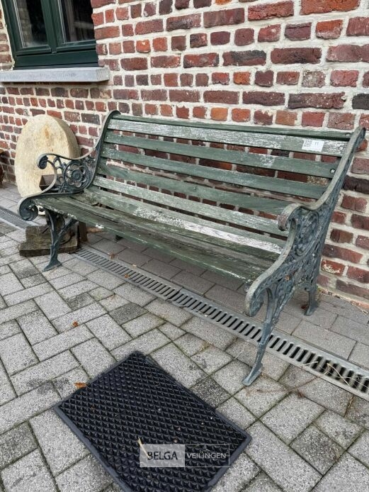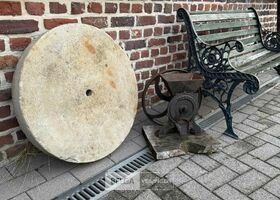 Oude tuinbank, lengte 1.26m. + maalsteen ø 71cm + oude vleesmolen.