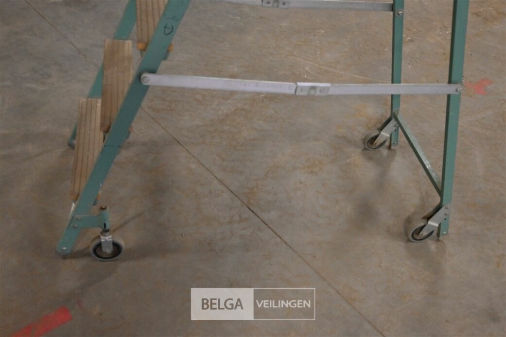 Overtoom trapladder, 6 houten tredes en groen metalen frame, verrijdbaar
