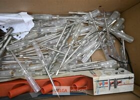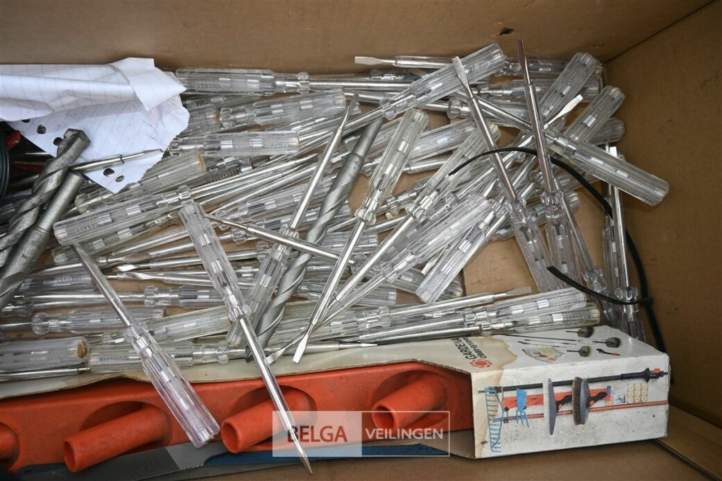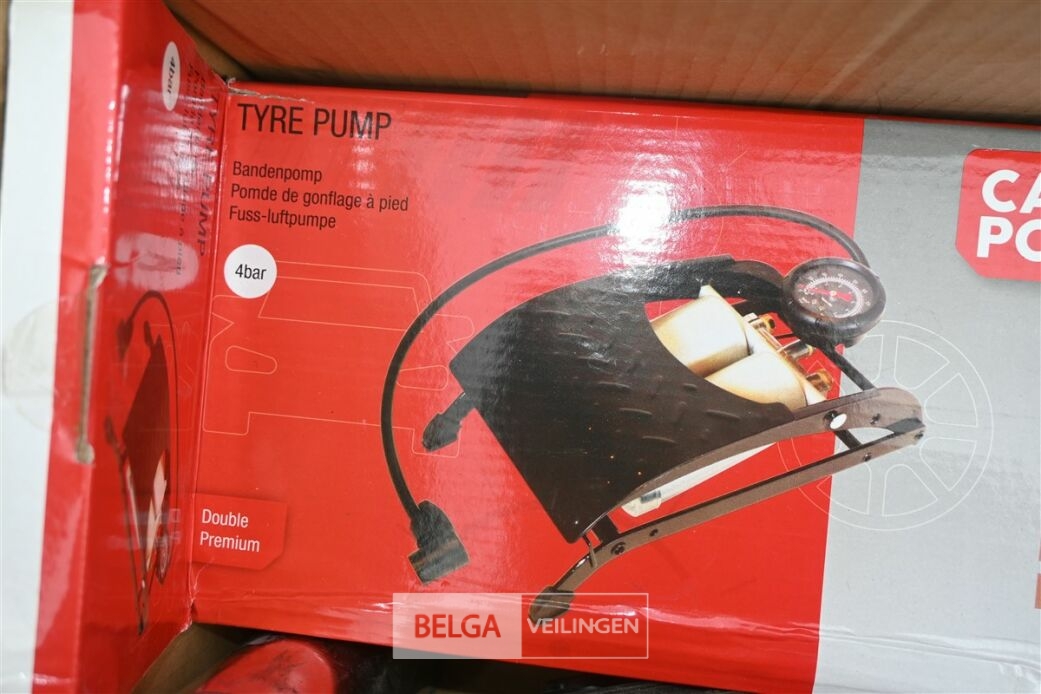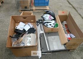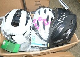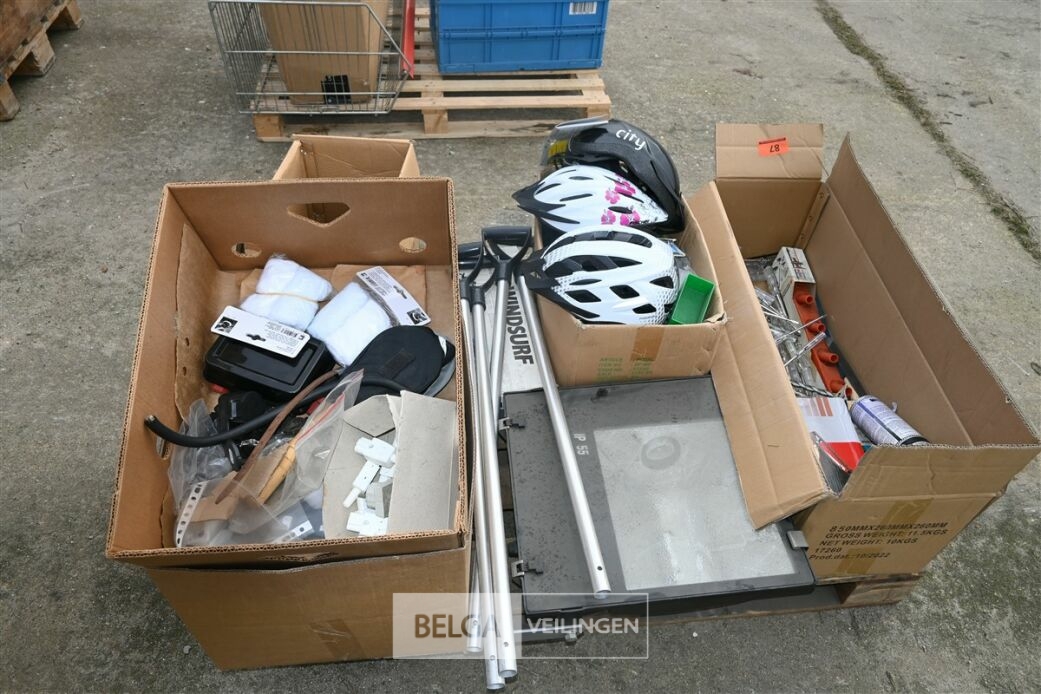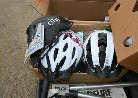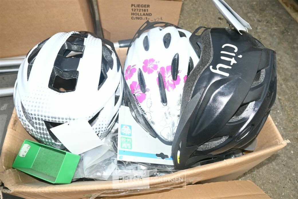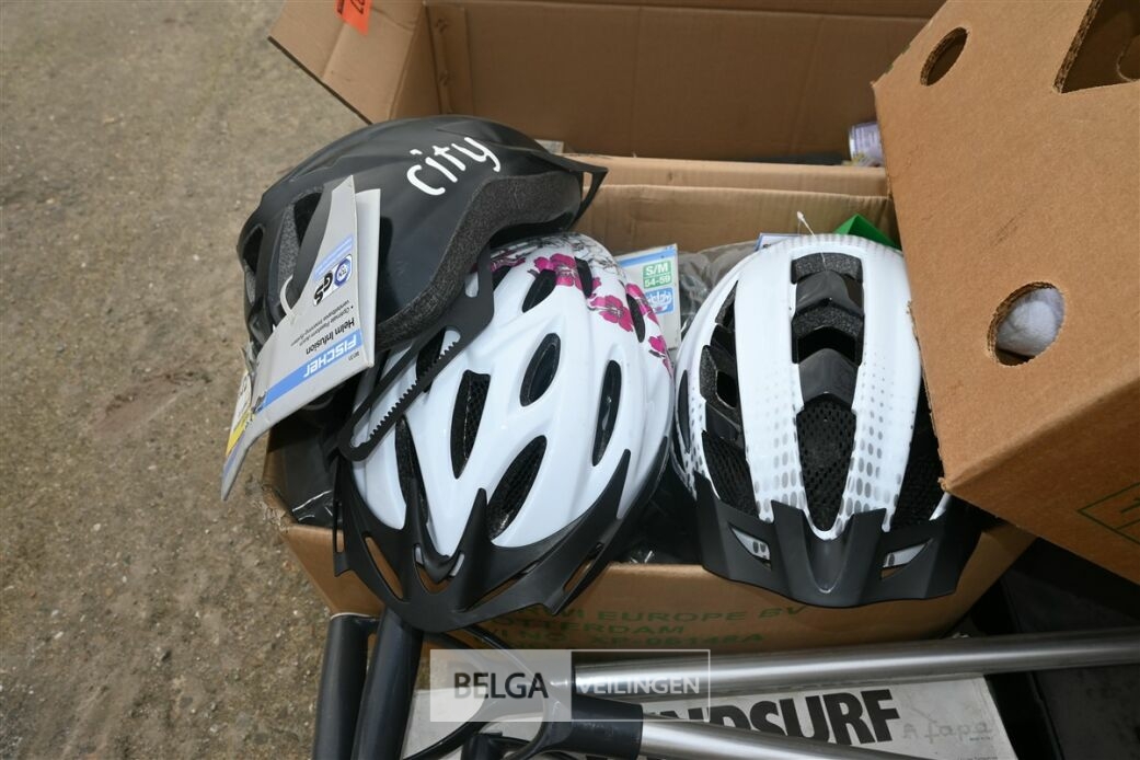 Partij divers met o.a fietshelmen, bandenpomp en schroevendraaiers