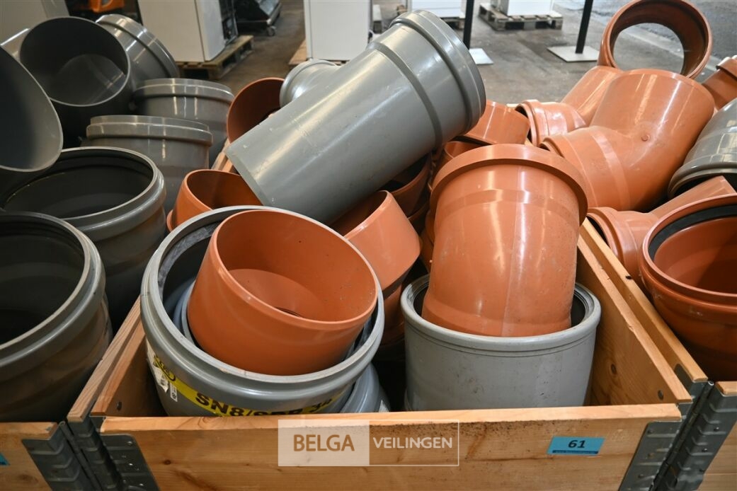 Partij diverse PVC hulpstukken, zonder de houten opbouwbak op de foto's
