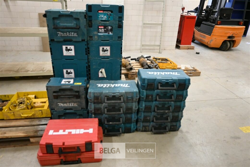 Partij gereedschapsdozen van Makita 18 stuks, Hilti 2 stuks en 1 houten bak