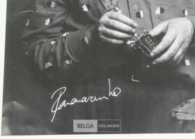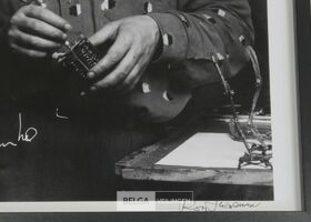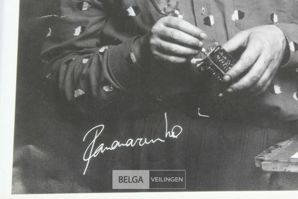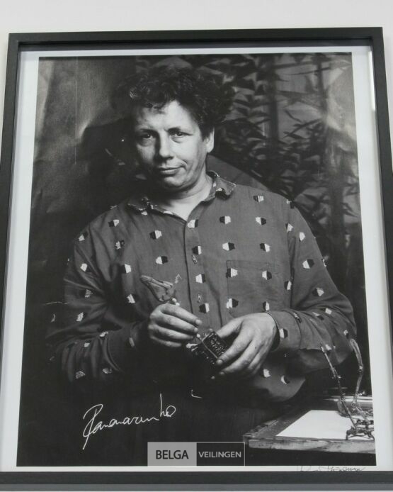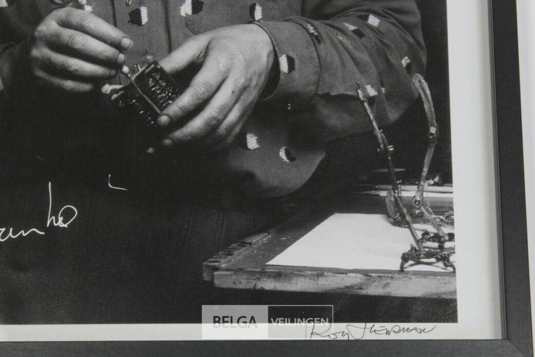 Panamarenko werkend aan object kip - Handgesigneerde foto (ook rechtsonder door Ronny Heirman - fotograaf) - in kader 43x53 - galerijprijs 250 euro