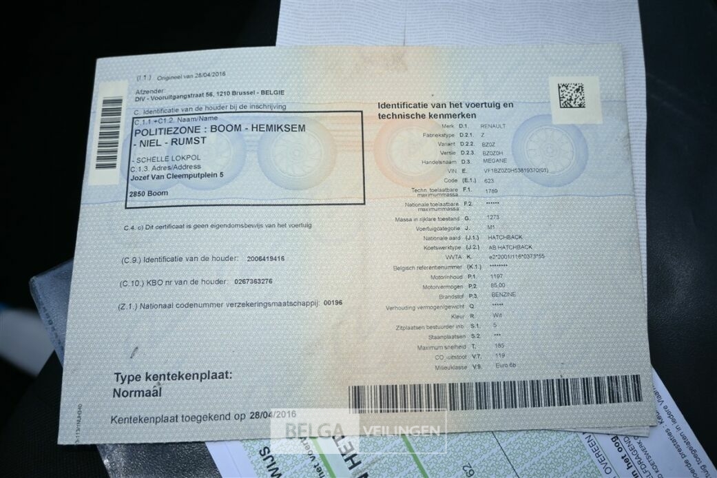 RENAULT MEGANE, chassisnummer VF1BZ0Z0H53819370, bouwjaar 2015, 63.127km, benzine euro 6b, motorinhoud 1197cm3, motorvermogen 85kW, handgeschakeld, extra set banden met velg, sleutel + boordpapieren (kentekenbewijs, gelijkvormigheidsattest en keuringsbewijs) aanwezig