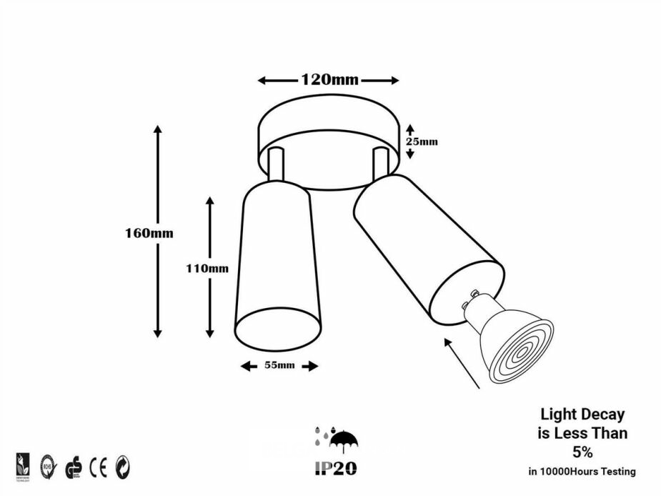 8 x Ronde plafondlamp GU10 – 2 verstelbare spots – Aantal spots: 2 – Afmetingen: Ø 55 x 110 mm – Muurbeugel: Ø 120 x 25 mm – Vorm: rond – Draaibare spots: 350° rotatie en helling 70° - Kleur: zwart - Spanning: 85-265V (50/60Hz) - Beschermingsgraad: IP20 - Geschikt voor gebruik binnenshuis - GU10-lampen niet inbegrepen - Inclusief montageset voor eenvoudige installatie - Ideaal voor decoratieve en functionele verlichting.
