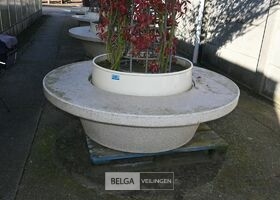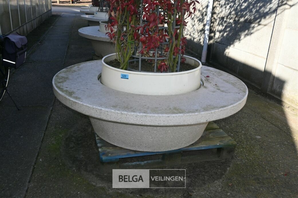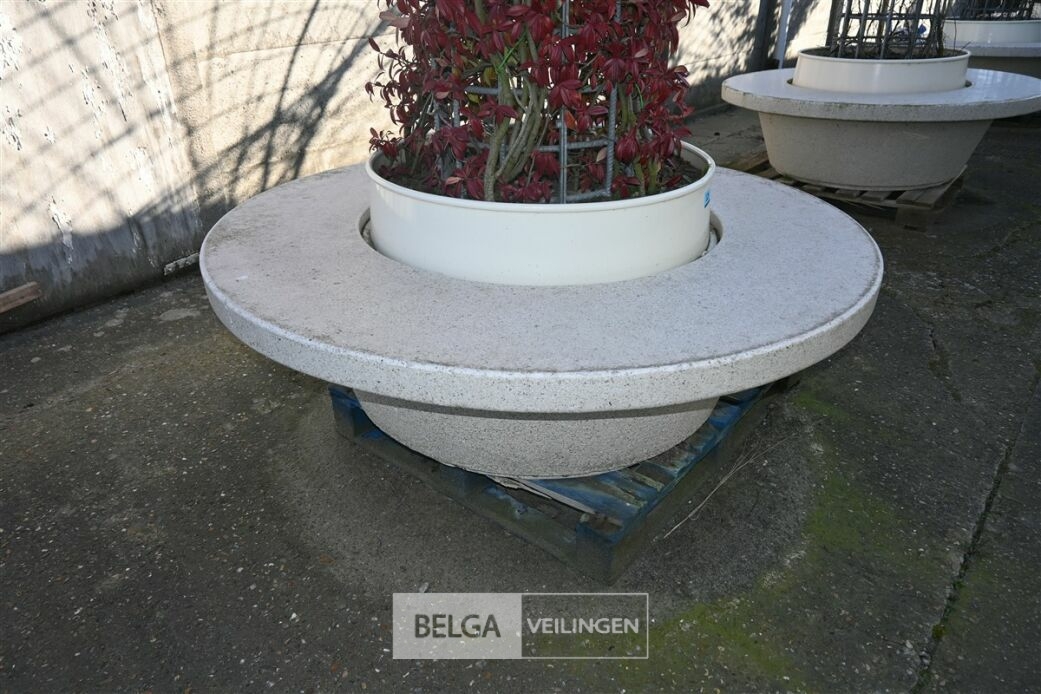 Ronde stenen zitbank met plantenbak en Toscaanse Jasmijn, diameter zitbank 170cm, diameter plantenrek boven 350cm