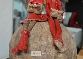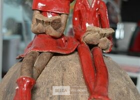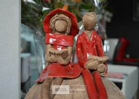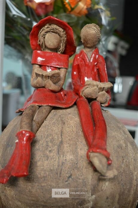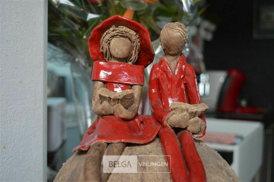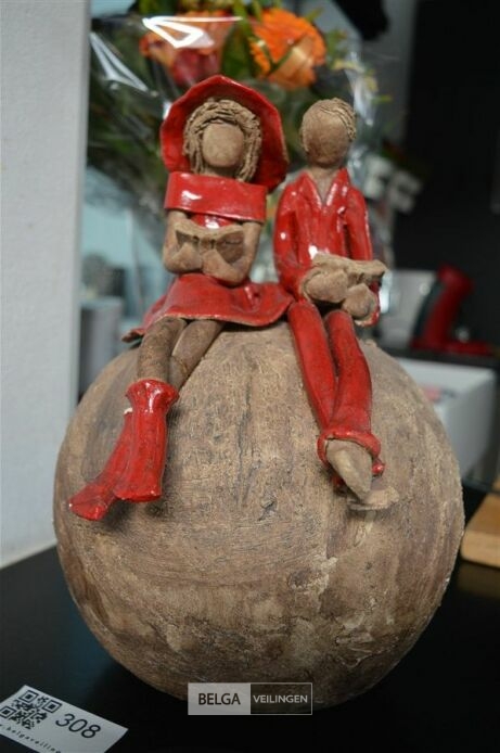 rustiek beeldje met 2 figuren op bol