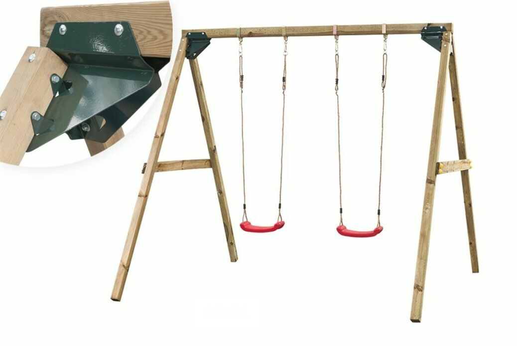 Deze dubbele houten schommel wordt geleverd met: 2 kunststof schommels, 4 stalen grondankers. Het schommeltoestel is gemaakt van glad geschaafd, drukgeïmpregneerd hout. De staanders en liggers zijn 9 cm dik, volledig glad afgewerkt en duurzaam behandeld voor langdurig gebruik. Technische gegevens: Afmetingen bouwpakket: 27x240x27 cm, Gewicht: 75kg