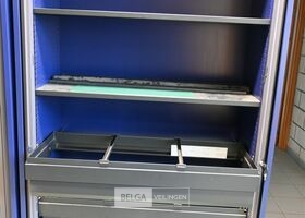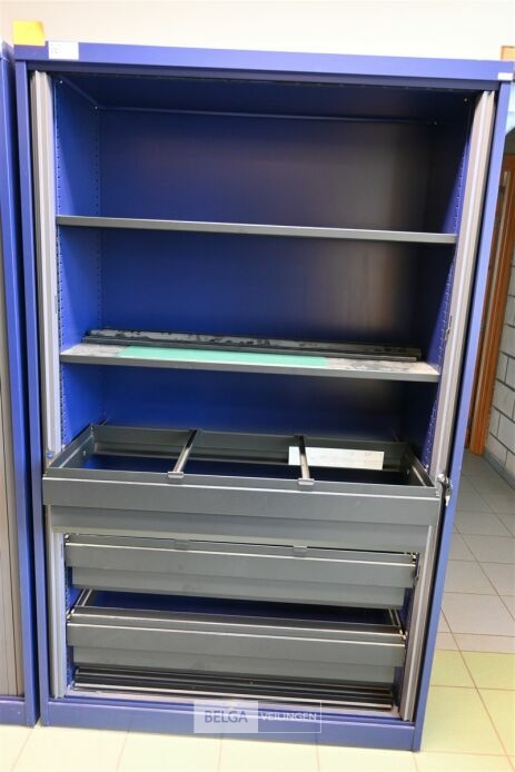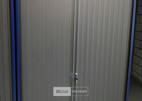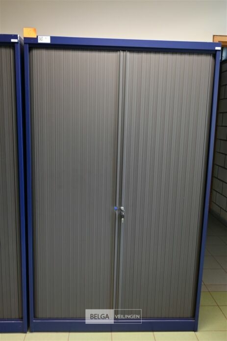 Schuifdeurkast MEWAF blauw met donkergrijze roldeuren / 3 hangklassementen en 2 leggers,afm ±120x48x198 cm (kavel te vinden op kantoor gelijkvloers)