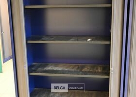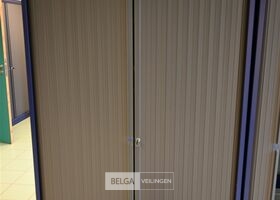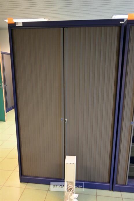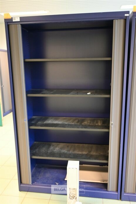 Schuifdeurkast MEWAF blauw met donkergrijze roldeuren / 4 leggers, afm ±120x48x198 cm (kavel te vinden op kantoor gelijkvloers)