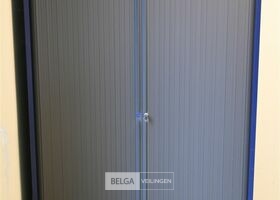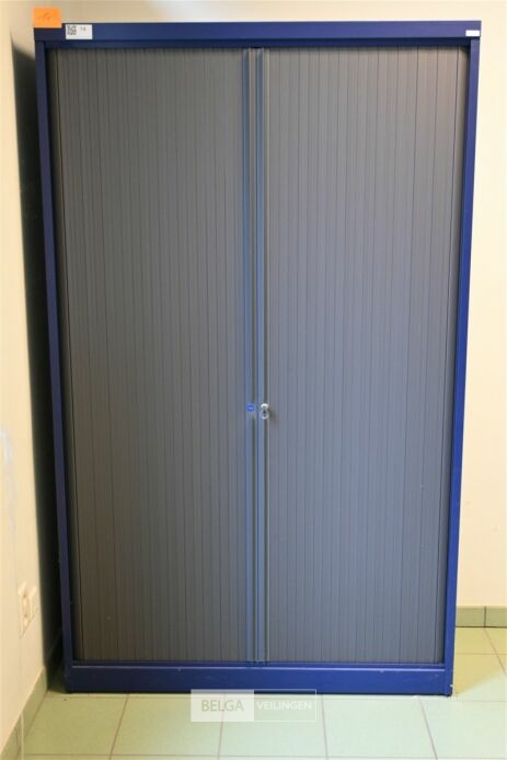 Schuifdeurkast MEWAF blauw met donkergrijze roldeuren / 4 leggers, afm ±120x48x198 cm (kavel te vinden op kantoor gelijkvloers)
