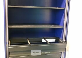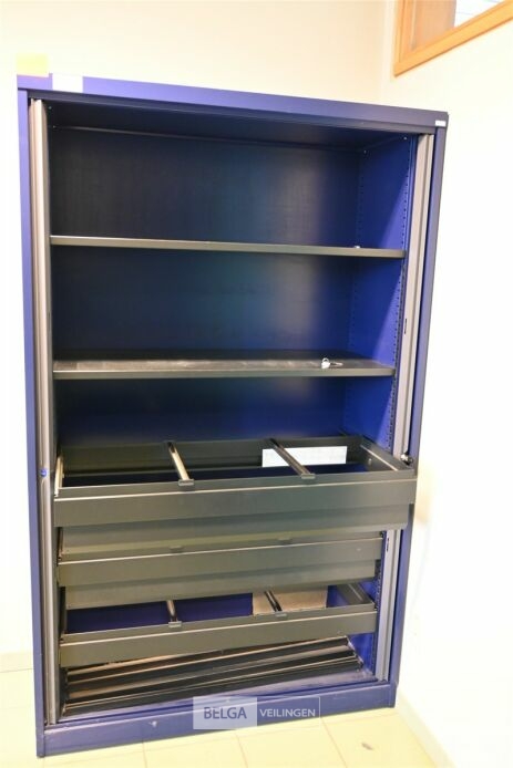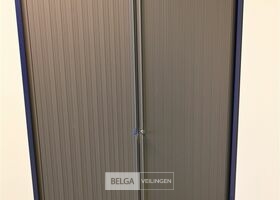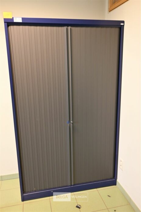 Schuifdeurkast MEWAF blauw met donkergrijze roldeuren / 3 hangklassementen en 3 leggers, afm ±120x48x198 cm (kavel te vinden op kantoor gelijkvloers)