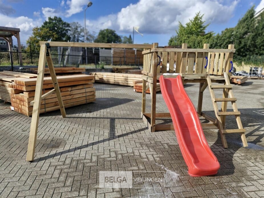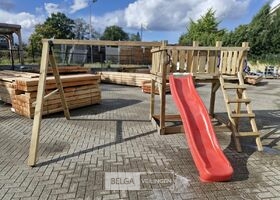 Speeltoren robusto. Vloerhoogte 125cm, Materiaal: palen & schommel 88x88mm, glijbaan kunststof kleur rood, geleverd incl. 2 st handvast-4 schommelhaken-1 st grond ankers voor palen van schommel te verankeren, geleverd incl bevestigingsmateriaal en handleiding. Deze wordt geleverd in een bouw pakket.