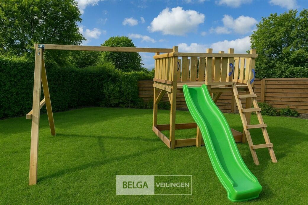 Speeltoren robusto. Vloerhoogte 125cm, Materiaal: palen & schommel 88x88mm, glijbaan kunststof kleur groen, geleverd incl. 2 st handvast-4 schommelhaken-1 st grond ankers voor palen van schommel te verankeren, geleverd incl bevestigingsmateriaal en handleiding. Deze wordt geleverd in een bouw pakket.