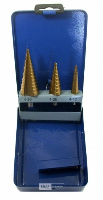 3-dlg. set uit 4-12 mm 5 trappen, 4-20 mm 9 trappen en 4-30 mm 15 trappen.-geschikt voor gebruik in bijna alle materialen zoals metaal-hout kunstof enz