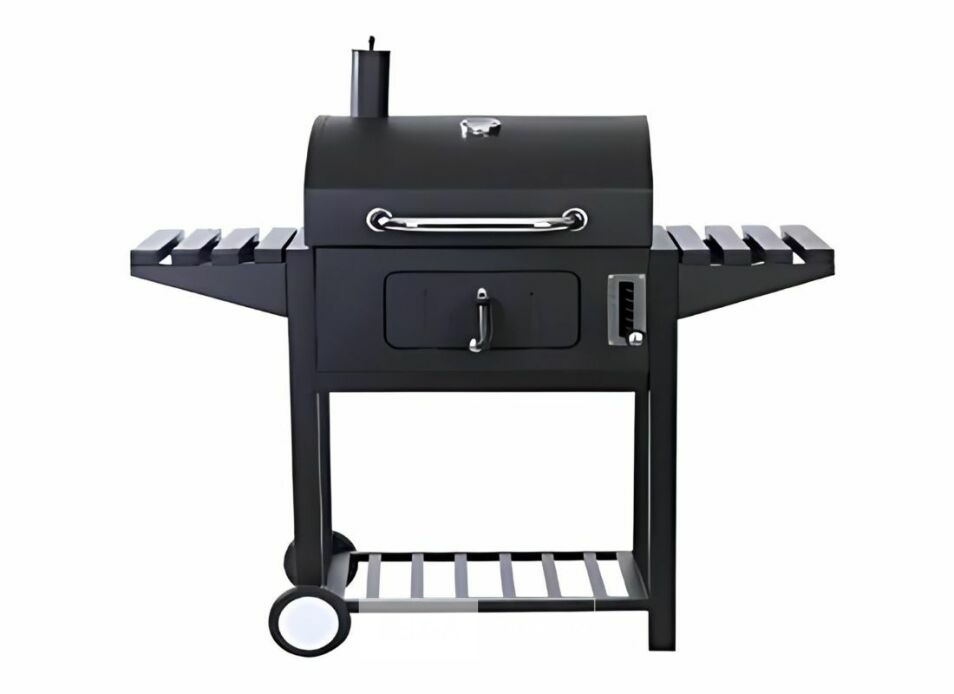 Steenkool – Hout BBQ: Productafmetingen: 128x62x108cm | Kookoppervlak: 600x450mm, Grillroosters van geëmailleerd staal | Warmhoudrek: Warmhoudrek van geëmailleerd staal | Deksel: Staal, met zwarte poedercoating en roestvrijstalen schuifgreep | Thermometer: Roestvrij staal | Vuurkast: Staal, met zwarte poedercoating | Luchtafvoer: Roestvrijstalen luchtafvoer met kunststof handgreep | Houtskoollade: Gegalvaniseerde houtskoollade, dikte 0,80mm | Temperatuurregeling: 6 niveaus in hoogte verstelbaar via tandwiel aan de voorzijde | Houtskooldeur: Staal, met zwarte poedercoating | Aslade: Staal, met zwarte coating, eenvoudig vanaf de voorkant te verwijderen | Bijzettafel: Staal, geïntegreerd met 8 houten stangen met in totaal 6 S-haken | Onderste plank: Staal, geïntegreerd met houten stangen | Wiel: 2 kunststof wielen van 15 cm | Verpakking: Verpakking in 5 lagen bruine kartonnen doos | Poten: Stalen buispoten, met zwarte poedercoating