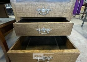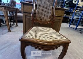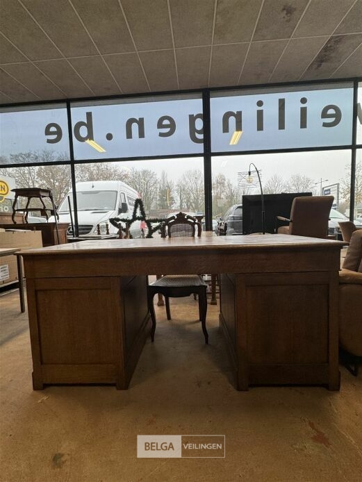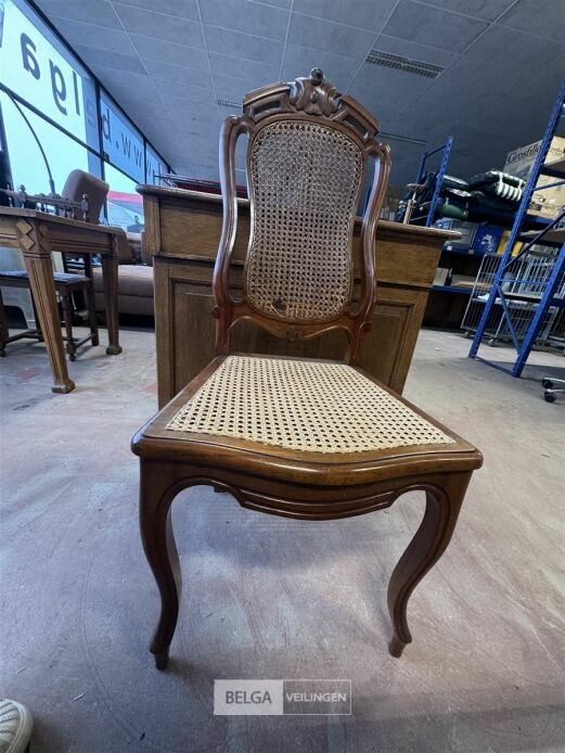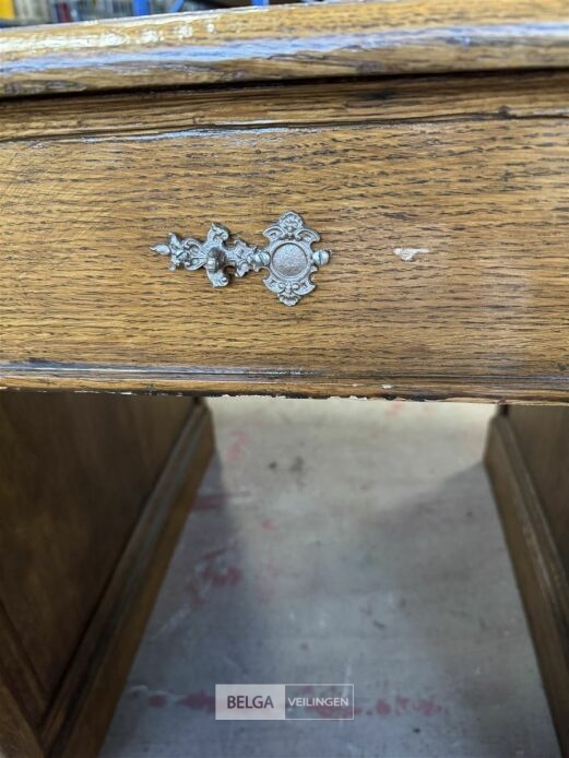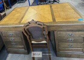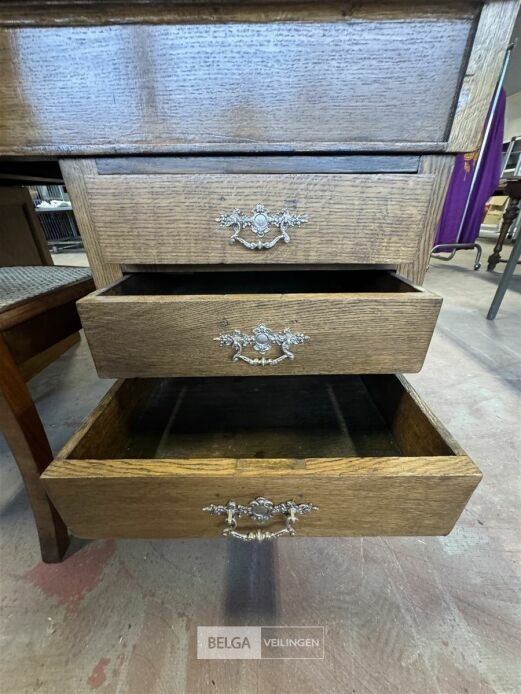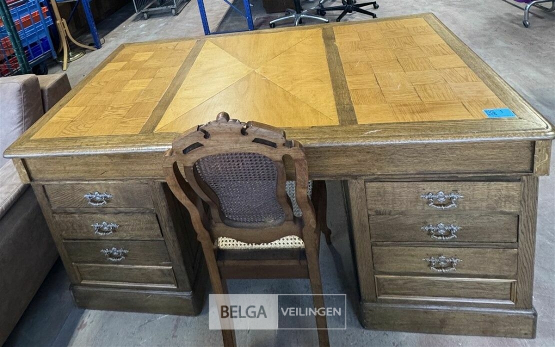 Stijlbureel met rieten stoel, gebruiksporen -afm. bureel ±175 x 84 x 80 cm) en 6 lades afm. ± 62 x 40 x 9 cm) en rieten stoel beschadigd aan rugleuning (zithoogte stoel ±46 cm) – versierde handgreep deels afgebroken