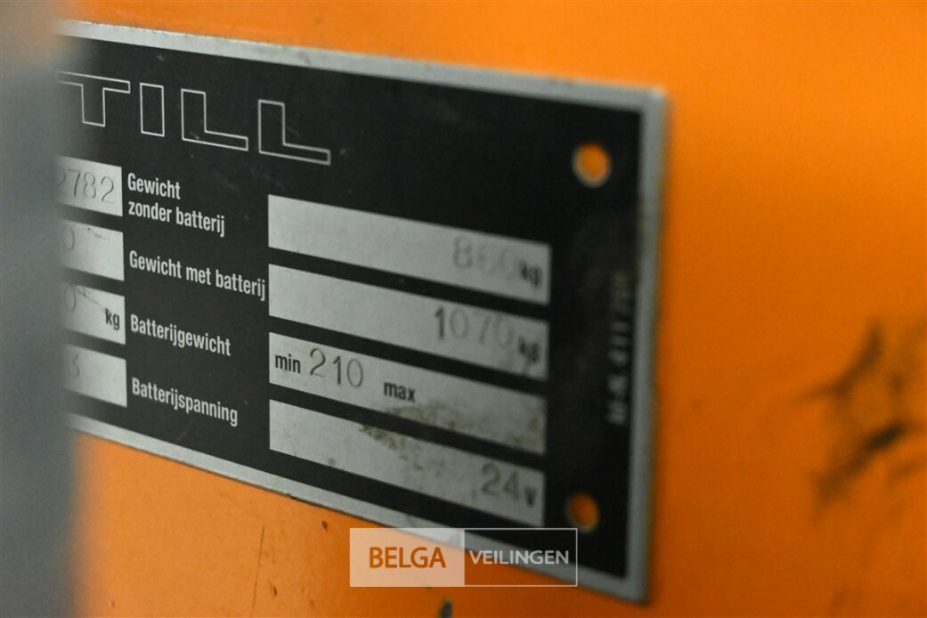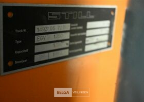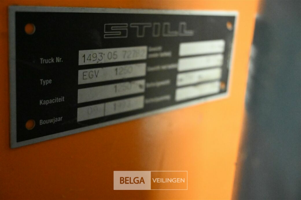 Still stapelaar EGV 1205, Bouwjaar 09/1993, draagvermogen 1250 Kgr. batterijspanning 24V., hefhoogte 2,80m., standaardmast, rolwielen aan de voor- en achterzijde. Met automatische lader Still. OPGELET: De werking van het artikel is onbekend en niet getest. Artikelen met een batterij (voertuigen, machines, e.d.) hebben mogelijk een platte batterij. De koper dient zelf in te staan voor startmiddelen. Het artikel kan geïnspecteerd worden tijdens de kijkdag. Het artikel wordt verkocht in de staat waarin het zich bevindt, met zichtbare en onzichtbare gebreken.