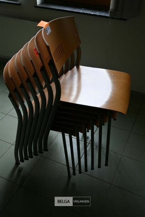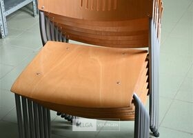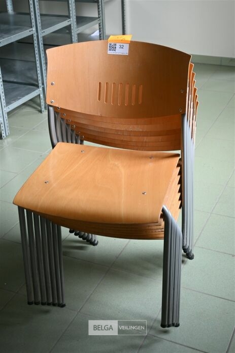 7 Houten stoelen met grijs metalen onderstel (kavel te vinden op 1ste verdiep)