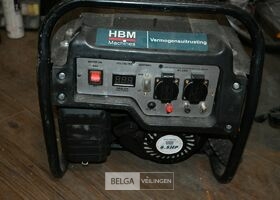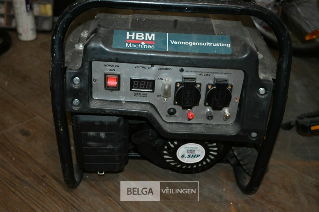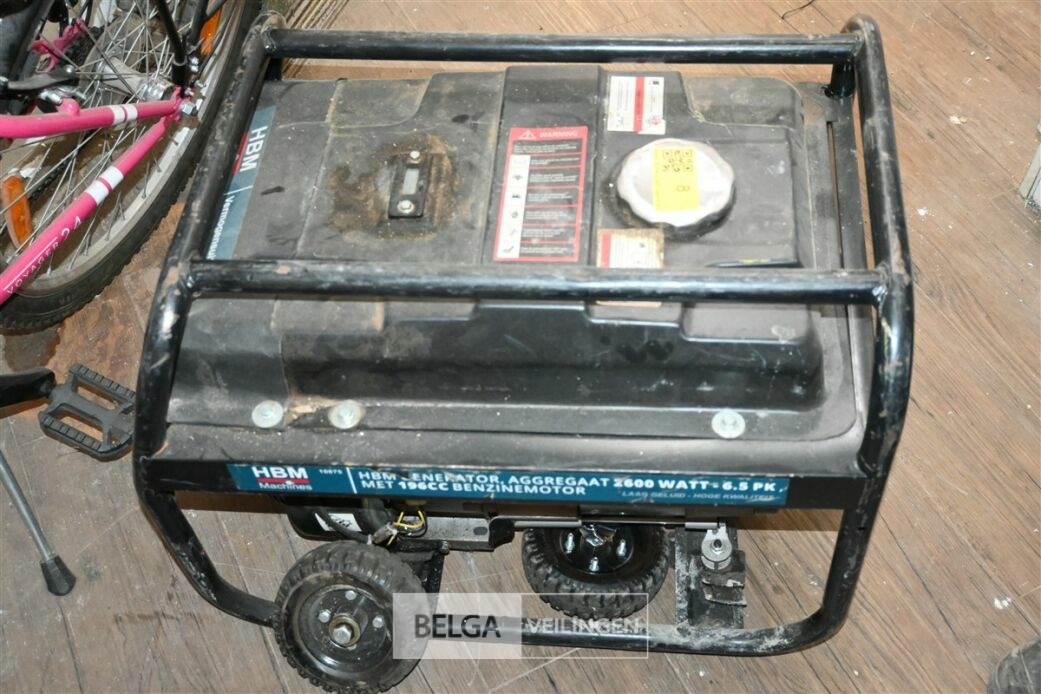 Stroomgenerator HBM, 2x 220V, 2600 W. op benzinemotor van 196 cc, 6,5pk, in goede staat, nog werkend, onderstel licht beschadigd.