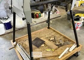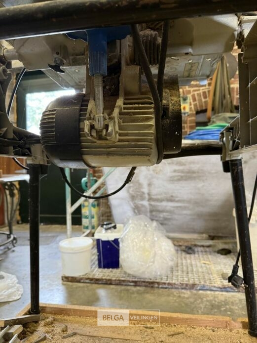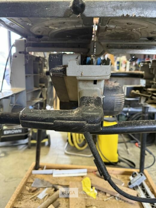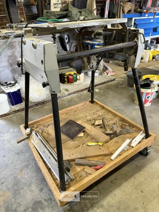 Tafelzaagmachine op voet. Merk onbekend, op kar met wielen. Hoogte: 90 cm, met kar: 108 cm. De werking van het artikel is onbekend en niet getest. Het artikel wordt verkocht in de staat waarin het zich bevindt, met zichtbare en onzichtbare gebreken. Maak gebruik van het kijkmoment om u te voorzien van de nodige indrukken.’