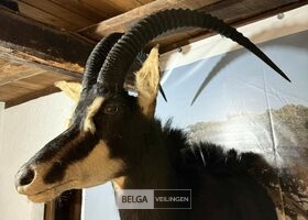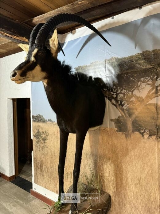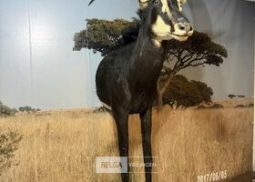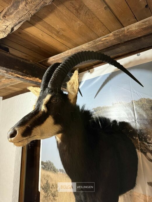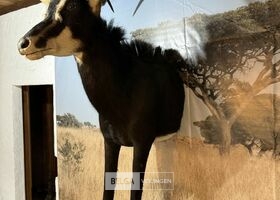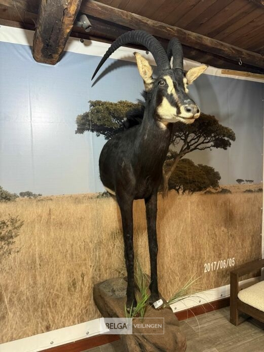 Taxidermie sabelantilope, totale hoogte ± 2.00m, met achtergrondzeil afm 2.95x2.50 m.