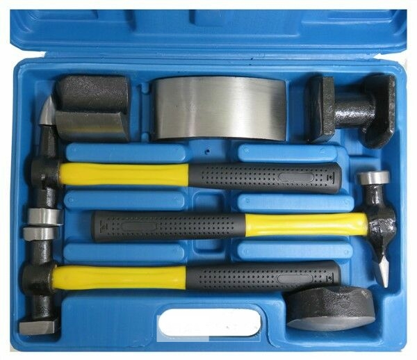 Uitdeukset 8-dlg.-8-dlg. uitblutsset bestaande uit 5 meeste gebruikte tassen voor het uitblutswerk en 3 plaatsslagerhamers alle met een glasvezelsteel.