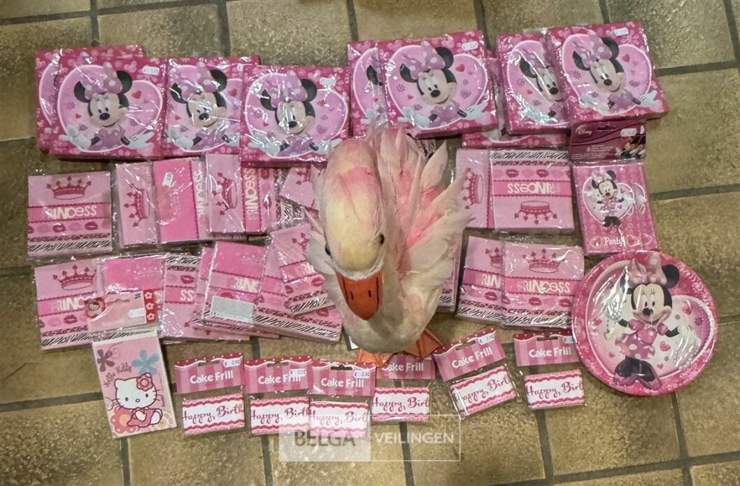 Verjaardagsmateriaal - O.a.: servetten , cakehouders, bordjes, decoratieve ooievaar 60 cm