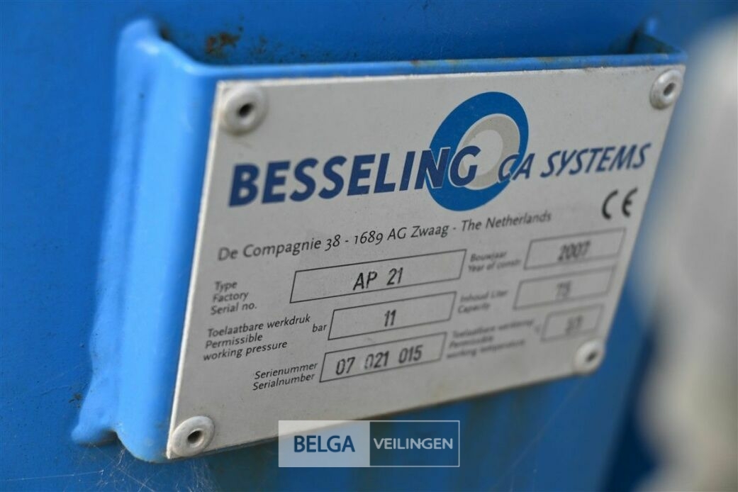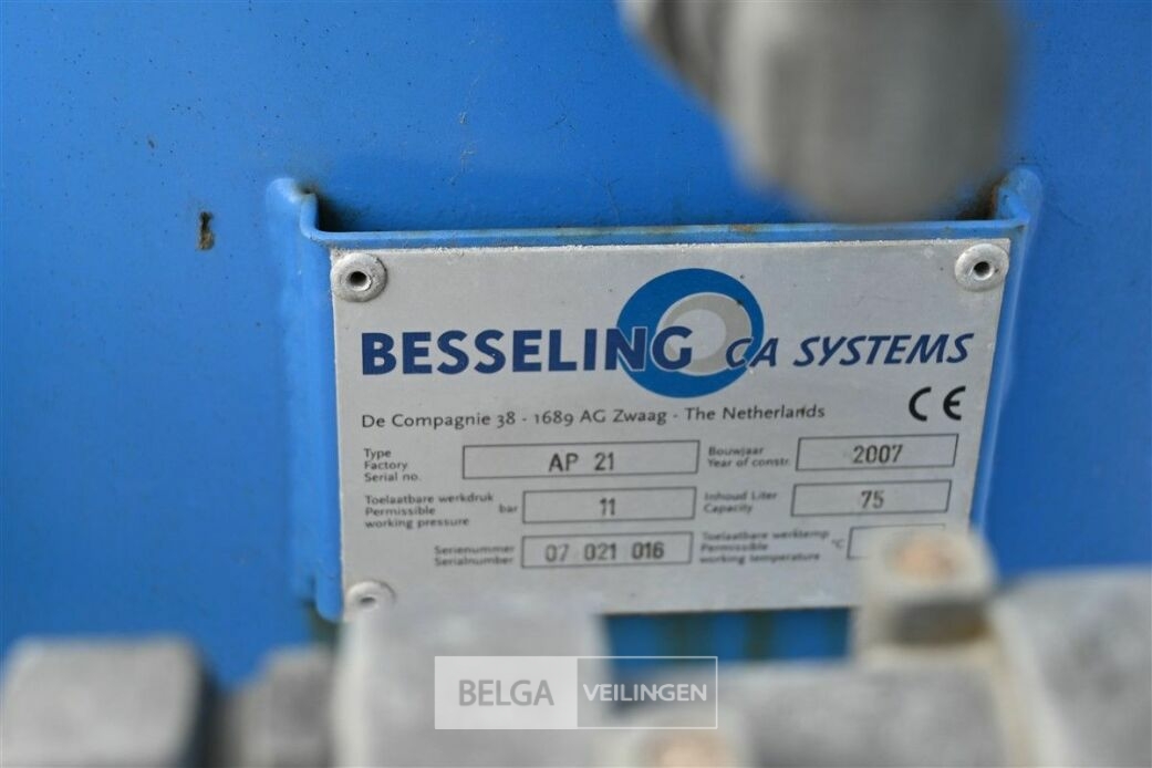 Watergekoelde compressor Besseling Ca Systems, type ap21, werkdruk 11bar, 75Ltr inhoud, bouwjaar 2007, serienummer: 07.021.016. De werking van het artikel is onbekend en niet getest.