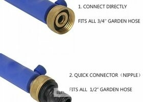Universele compatibiliteit: Deze hogedruksproeier past op alle standardaard tuinslangen (¾") in kan worden aangepast aan andere maten met een 1" vrouwelijke slangaansluiting. Bovendien is hij compatibel met aangedreven hogedrukreinigers door gebruik te maken van de meegeleverde adapter, waardoor hij veelzijdig en handig is voor verschillende apparatuur.